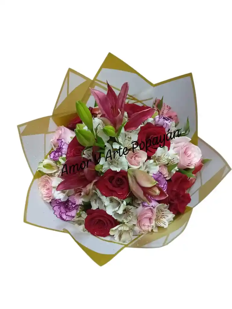 Bouquet de lirios bañado en rosas surtidos. Incluye: moño, tarjeta con mensaje personalizado, aroma y brillo