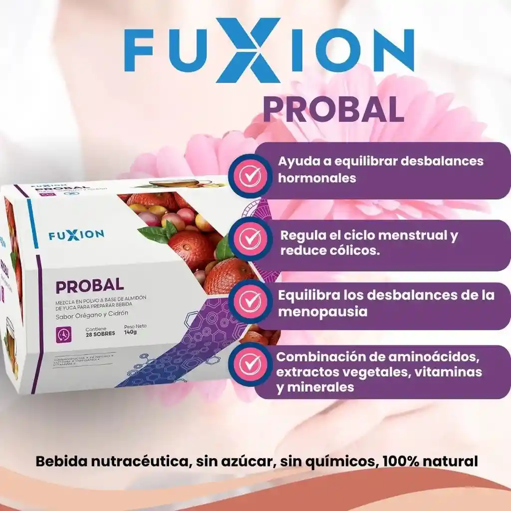 🛡️ Fuxion Probal - Refuerza tus defensas desde el intestino Fuxion Probal es un suplemento nutricional natural que combina probióticos, prebióticos y antioxidantes para fortalecer el sistema inmune y mejorar la salud intestinal. Su fórmula avanzada ayuda a equilibrar la microbiota intestinal, proteger el cuerpo frente a agentes externos y reducir la inflamación. Contiene ingredientes como inulina, fibra prebiótica, vitamina C, zinc, y cepas probióticas que restauran la flora intestinal, esencial para una buena digestión y un sistema inmune fuerte. ✅ Beneficios principales: Refuerza el sistema inmunológico. Restaura el equilibrio de la flora intestinal. Mejora la absorción de nutrientes. Contribuye a la salud digestiva. Apoya la defensa natural del cuerpo. 📦 Presentación: Sobres individuales listos para mezclar con agua.