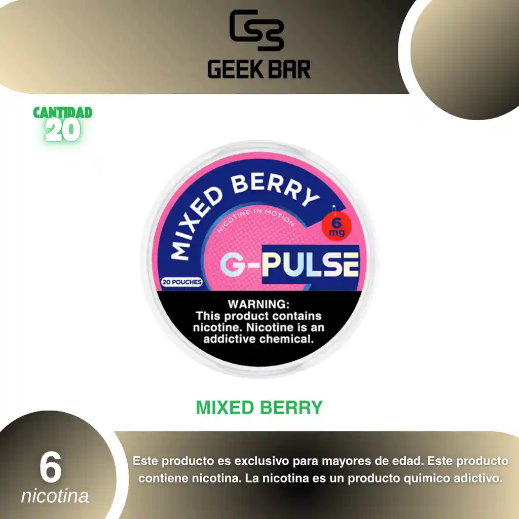 G Pulse Pouches Frutos Rojos 6 Mg x 20 Und PROHIBIDA LA VENTA A MENORES DE EDAD. ADVERTENCIA: ESTE PRODUCTO CONTIENE NICOTINA, LA NICOTINA ES UNA SUSTANCIA QUIMICA ADICTIVA Y NOCIVA PARA LA SALUD. Los líquidos para vapeo contienen: propilenglicol USP, glicerina USP, sabor artificial y nicotina. Este producto puede contener nicotina, una sustancia altamente adictiva que puede generar dependencia, posibles afectaciones arteriales, cardiacas, pulmonares y otras aun no identificadas. No se recomienda su uso a mujeres en embarazo, puede generar lesiones al feto. Mantener alejado de niños y mascotas. No ingerir, puede generar irritación y/o intoxicación. Por favor antes de consumir consulte a su médico posibles afectaciones o sensibilidad a alguno de sus componentes. Los componentes de este producto pueden aumentar la sensación de ansiedad En caso de notar alguna reacción adversa por favor suspenda su uso de manera inmediata. Siga las instrucciones en el envase. No alterar sus componentes. Adquiera sus productos en sitios de confianza No use productos piratas, alterados, o en los cuales no pueda comprobar su buena procedencia, Verifique la reputación del fabricante y distribuidor antes de adquirir cualquier producto Si no es usuario fumador o vapeador no se recomienda su uso bajo ninguna circunstancia Al usar este producto usted es consciente que este producto puede generar afectaciones a su salud, incluyendo aquellas que a la fecha de la compra no se han identificado y que pueden aparecer a largo plazo