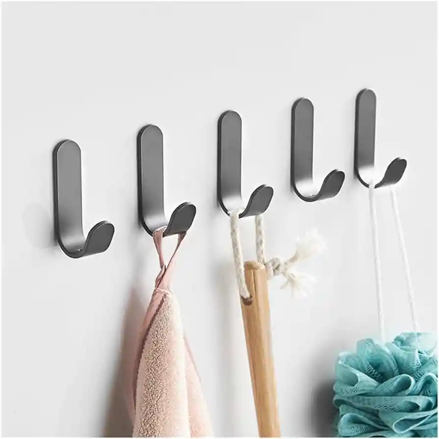 Hechos de acero inoxidable, que no se oxida ni se corroe, asegurando durabilidad y fiabilidad. Perfecto para fijar a la pared de un baño., Gancho en ángulo J, no se caerá cuando se expone al agua. Fácil de instalar: no hay necesidad de taladrar agujeros y sin necesidad de herramientas. Incluye: 5 ganchos 1 pegamento