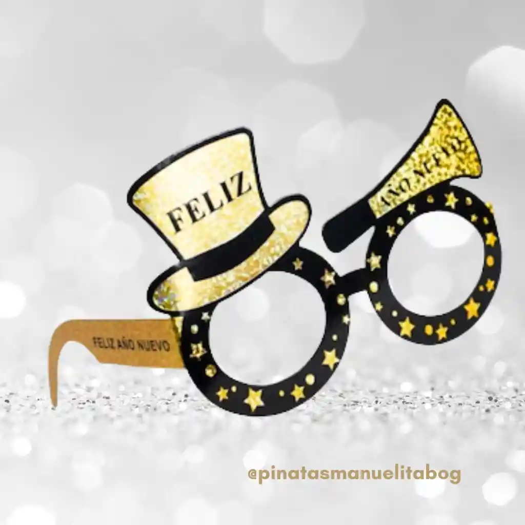 Gafas en cartón en color negro con detalles dorados y estampado Feliz Año Nuevo. Accesorios happy new year, accesorios año nuevo, fin de año 2026.