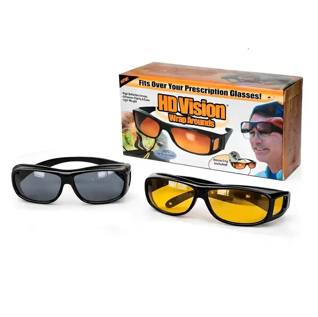 Este exclusivo kit de gafas HD Vision Wrap Arounds es la solución definitiva para mejorar la seguridad y el confort visual durante la conducción y actividades al aire libre, permitiendo su uso cómodo incluso sobre sus lentes de prescripción habituales. El set incluye un par de lentes oscuros polarizados diseñados para el día, que reducen drásticamente el resplandor solar y bloquean el 100% de los rayos UV, y un par de lentes ámbar de alta definición especializados para la noche, los cuales filtran el deslumbramiento de los faros contrarios y mejoran el contraste en condiciones de poca luz o lluvia. Gracias a su diseño envolvente con micas laterales, eliminan los puntos ciegos y ofrecen una protección periférica completa, todo en una estructura ligera y resistente que se adapta a cualquier usuario que busque una visión nítida, colores vibrantes y máxima protección ocular en todo momento. Ficha Técnica Modelo: Wrap Arounds High Definition Cantidad de gafas por kit: 2 unidades (Día y Noche) Tipo de lentes: Polarizados (Día) y HD Ámbar (Noche) Protección: UV 400 (Bloqueo 100% de rayos UVA y UVB) Material del marco: Policarbonato ligero de alta resistencia Color del marco: Negro brillante Diseño: Envolvente (Permite uso sobre gafas recetadas) Medidas frontales: 14.5 cm de ancho x 4 cm de alto Largo de patillas: 14.5 cm Accesorios incluidos: Estuche de transporte con clip para cinturón Género: Unisex Uso recomendado: Conducción nocturna, días soleados, pesca, ciclismo y deportes al aire libre Términos de garantía:Para defectos de fábrica o retractos: Por favor revise el producto apenas lo reciba y antes de usarlo. No aplican ley de retracto o defectos de fábrica luego de usar el producto. Se manejan máximo 5 días para reportar defectos de fábrica (por ejemplo, producto funciona mal, piezas faltantes, rotas, etc). Para hacer efectiva la devolución el producto debe devolverse con el empaque original, el cual debe estar en buen estado, incluir todos los documentos y las partes completas y sin daños.