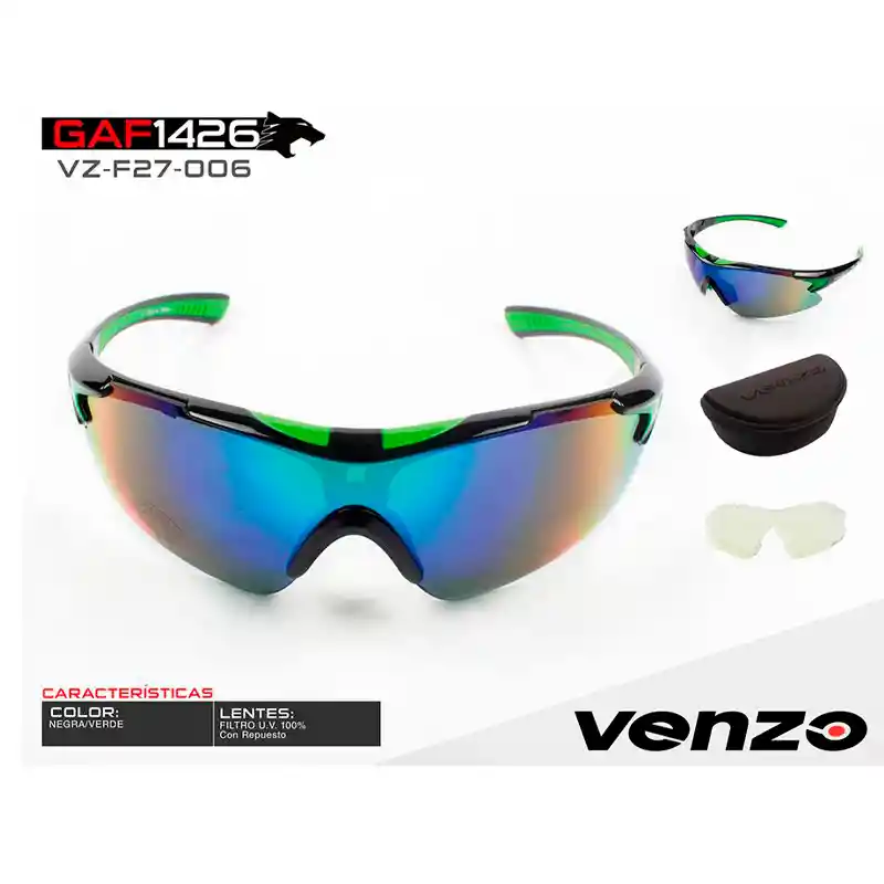 Estas gafas se han caracterizado por transmitir energía y color en cada uno de sus diseños, la filosofía de la marca es convertir cada pedaleo en una nueva experiencia y encontrar un instrumento para escapar de la cotidianidad, divertirse e inspirar a ir más allá de tus límites INCLUYE: -Dos lentes intercambiables (transparente y amarillo) -Estuche de lujo -Bolsa de micro fibra -Estuche original Venzo CARACTERÍSTICAS: -Material: PE- Patillas de Goma - Filtro UV100 garantizado -Color: Negro brillante/Verde brillante GARANTÍA: La garantía de este producto es sólo por defectos de fabricación y no obedece a defectos ocasionados por mal uso o mal almacenamiento.