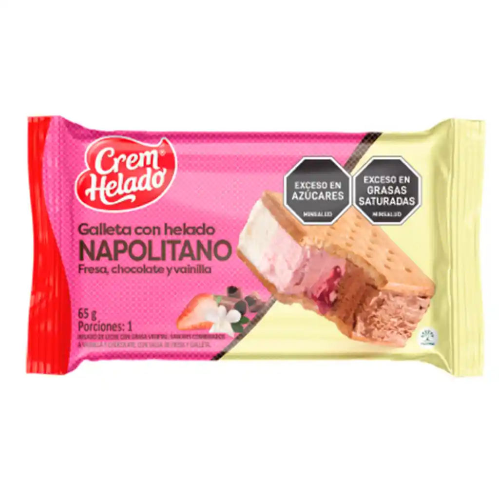 Helado cremoso a base de leche y grasa vegetal, con sabor napolitana y galleta, acompañado de una rica salsa de fresa.