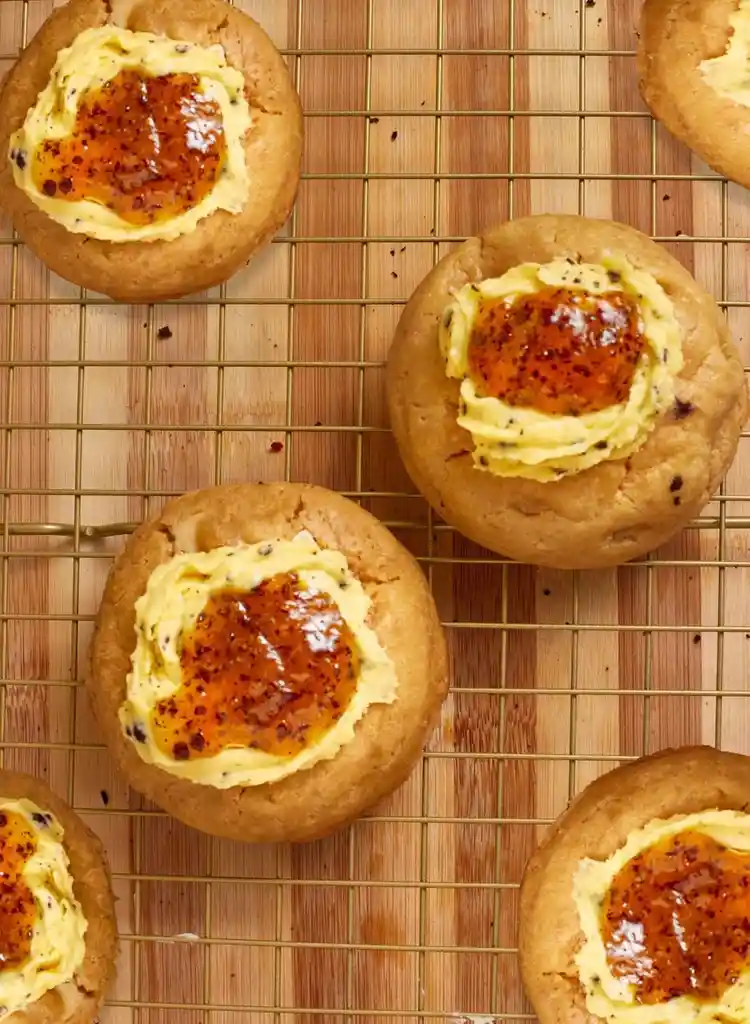 galleta artesanal de vainilla rellena de un cheesecake de maracuya, decorada con un ganache y mermelada de maracuya