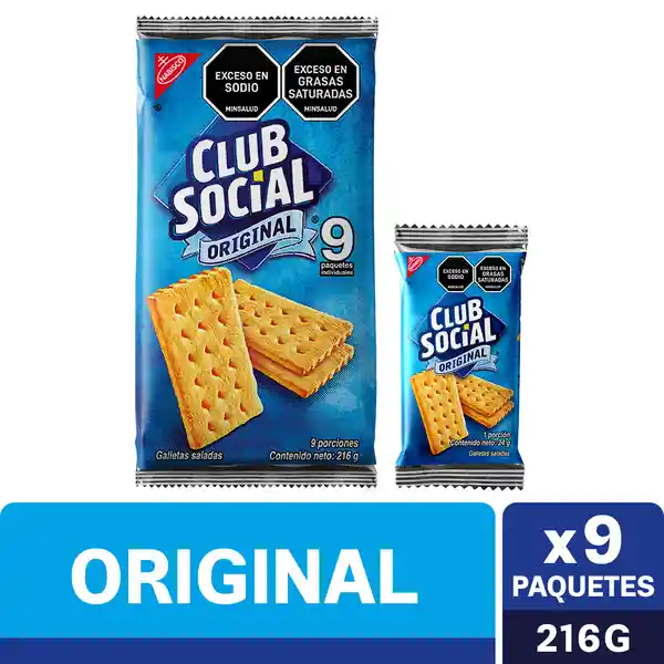 Galletas Saladas Club Social sabor Original. Contiene 9 paquetes de 24 grs c/u. Envase total 216g.