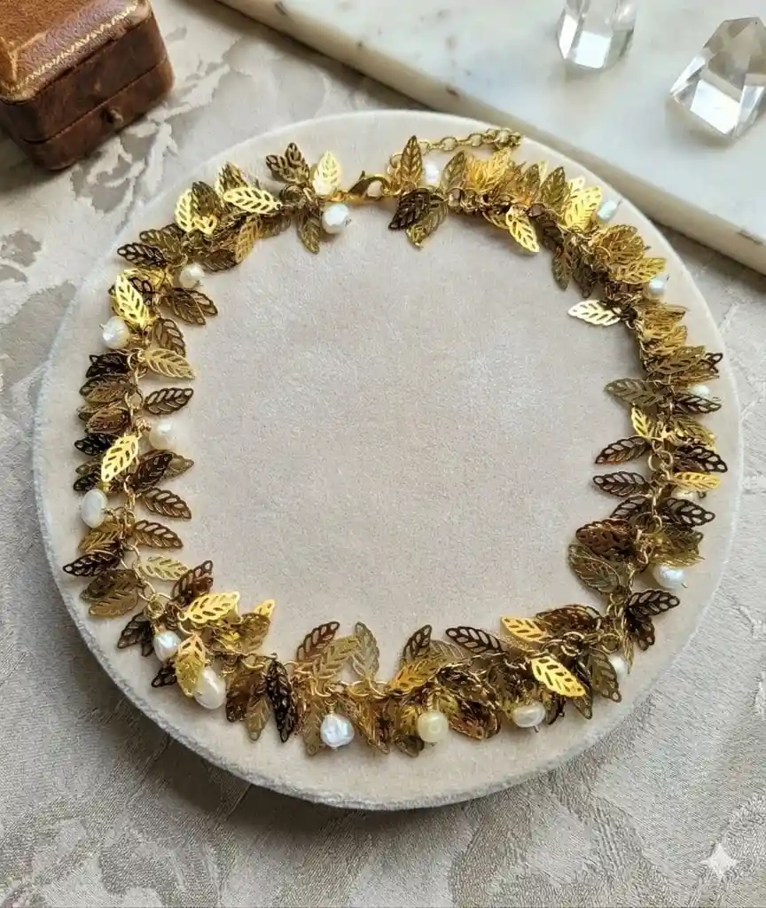 Collar elaborado artesanalmente que integra en su diseño único, diferentes elementos que lo llenan de simbolismo. Es una pieza atemporal, que brinda múltiples oportunidades para combinarlo Garantía de 30 días en acabados bajo condiciones normales de uso. Al ser una pieza ensamblada de forma artesanal el producto entregado puede presentar diferencias de colores y acabados al expuesto en la fotografía ;Tipo: Cadena en bronce en forma de hojas con baño en oro de 24k, y perlas del rio .Diseño: Único con elementos llenos de simbolismo, Estilo: Atemporal con múltiples opciones de combinación, Elaboración: Artesanal con posibles variaciones en colores y acabados, Garantía: 30 días en acabados bajo condiciones normales de uso,