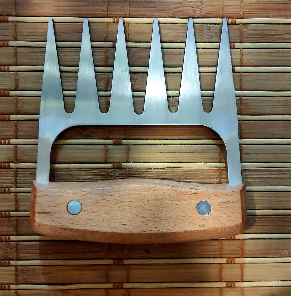 Las Garras de Oso están diseñadas para triturar, levantar y trinchar la carne, obteniendo desmenuzados perfectos sin necesidad de cuchillos ni tenedores, cuenta con 6 puntas afiladas que agarran fuertemente la carne y la desgarran fácilmente sin ningún tipo de lucha, además son sumamente ligeras y cómodas de sujetar. Material: metal y madera Medidas: 11 X 2 X 11 cm.