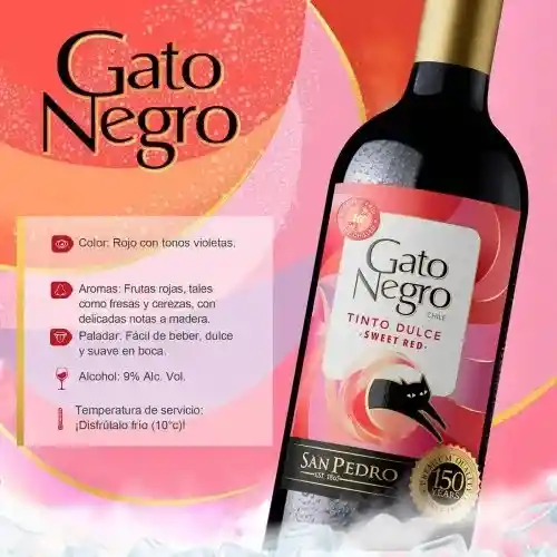 Gato Negro Tinto Dulce 750 ml 🍷✨ – Vino tinto dulce para disfrutar con estilo 📩 Escríbenos por el chat de Rappi o a nuestro WhatsApp +57 302 441 8058 para pedir tu botella 💬 Disfruta de Gato Negro Tinto Dulce 750 ml, un vino tinto con sabor dulce y afrutado, ideal para acompañar postres, comidas o disfrutar en reuniones con amigos y familiares. 1️⃣ Características: 🍷 Contenido: 750 ml 🔹 Sabor: Dulce y afrutado 🌟 Textura: Suave y agradable al paladar 📍 Origen: Chile 🧪 Ingredientes: Vino tinto fermentado con azúcar natural 📦 Presentación: Botella práctica y elegante 2️⃣ Beneficios: 😍 Sabor dulce y balanceado, perfecto para cualquier ocasión 🎉 Ideal para compartir en reuniones y celebraciones 🤤 Textura suave y fácil de beber 💖 Fácil de combinar con postres o comidas 👉 Abre tu botella y disfruta de un vino tinto dulce con responsabilidad 😋 🇬🇧 English Version 📩 Message us through Rappi chat or WhatsApp +57 302 441 8058 to order your bottle 💬 Enjoy Gato Negro Tinto Dulce 750 ml, a red wine with sweet and fruity flavor, perfect to pair with desserts, meals, or enjoy at gatherings with friends and family. 1️⃣ Features: 🍷 Content: 750 ml 🔹 Flavor: Sweet and fruity 🌟 Texture: Smooth and pleasant on the palate 📍 Origin: Chile 🧪 Ingredients: Fermented red wine with natural sugar 📦 Packaging: Practical and elegant bottle 2️⃣ Benefits: 😍 Balanced and sweet flavor, perfect for any occasion 🎉 Ideal for sharing in gatherings and celebrations 🤤 Smooth and easy-to-drink texture 💖 Easy to pair with desserts or meals 👉 Open your bottle and enjoy sweet red wine responsibly 😋