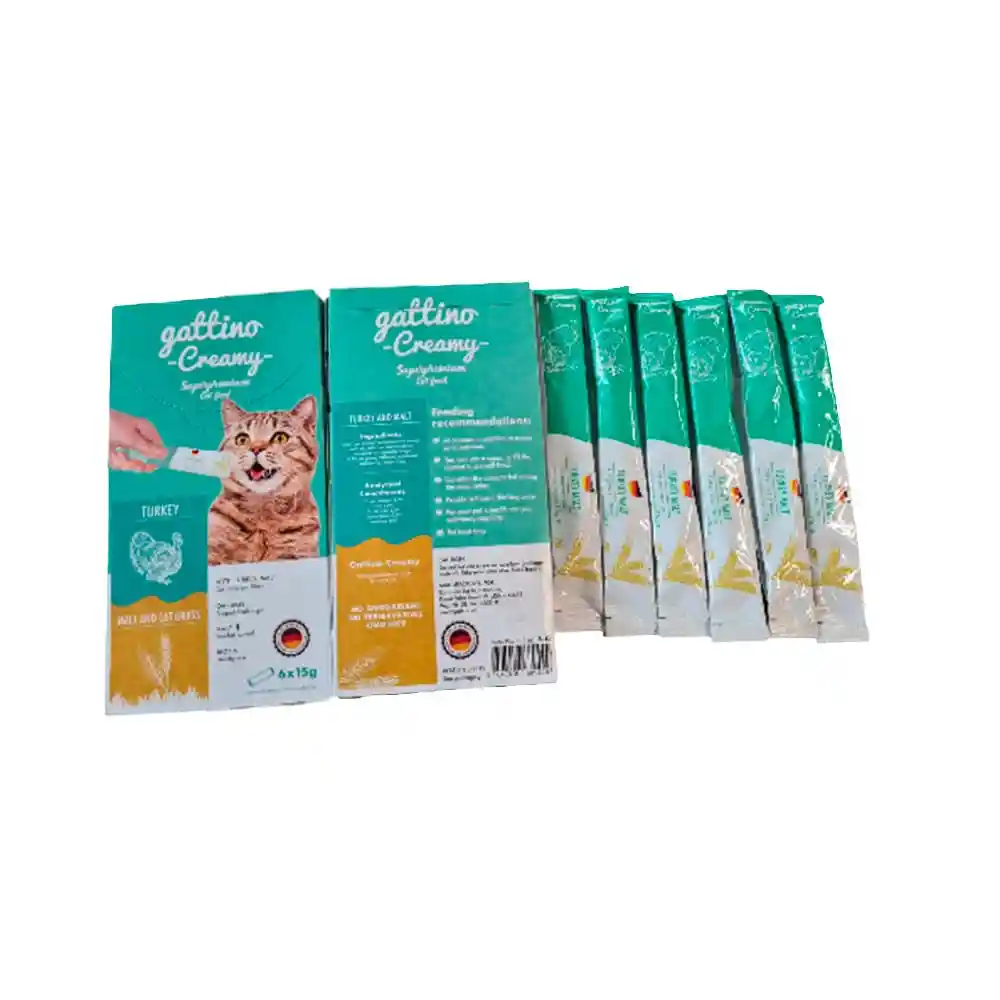 GATTINO CREAMY WITH TURKEY AND MALT & CAT GRASS un snack liquido es una opción natural y saludable, ¡Solo los sabores que a tu minino le encantan: delicioso pavo, malta y cat grass Con Malta que ayudan a mantener la salud intestinal y eliminar bolas de pelo. No contienen gluten, maíz ni soya, GMO Free, libres de preservativos químicos, colorantes o saborizantes!. Nuestra fórmula está cuidadosamente preparada con ingredientes frescos y saludables, garantizando momentos de deleite y nutrición incomparables.