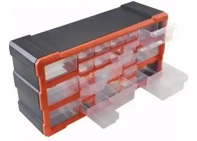 Material: El marco está hecho de poliestireno de alto impacto y los cajones son de polipropileno Color: Negro/Naranja Gavetas pequeñas: 14 UND Gavetas grandes: 8 UND Medida del Organizador: Largo: 49 cm Alto: 25 cm Ancho: 17 cm Medidas de las gavetas pequeñas: Alto: 3,5 CM Ancho: 5 cm Profundidad: 14 cm Incluye separadores para gavetas pequeñas: Ancho: 5 cm Alto: 3 cm Medidas de las gavetas grandes: Alto: 6 CM Ancho: 11 cm Profundidad: 14 cm Incluye separadores para gavetas grandes: Ancho: 11 cm Alto: 5,5 cm