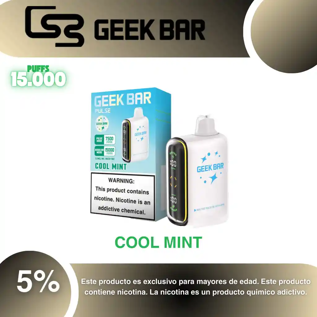Geek Bar Pulse 15.000 Puffs, Sabor Menta 5% PROHIBIDA LA VENTA A MENORES DE EDAD. ADVERTENCIA: ESTE PRODUCTO CONTIENE NICOTINA, LA NICOTINA ES UNA SUSTANCIA QUIMICA ADICTIVA Y NOCIVA PARA LA SALUD. Los líquidos para vapeo contienen: propilenglicol USP, glicerina USP, sabor artificial y nicotina. Este producto puede contener nicotina, una sustancia altamente adictiva que puede generar dependencia, posibles afectaciones arteriales, cardiacas, pulmonares y otras aun no identificadas. No se recomienda su uso a mujeres en embarazo, puede generar lesiones al feto. Mantener alejado de niños y mascotas. No ingerir, puede generar irritación y/o intoxicación. Por favor antes de consumir consulte a su médico posibles afectaciones o sensibilidad a alguno de sus componentes. Los componentes de este producto pueden aumentar la sensación de ansiedad En caso de notar alguna reacción adversa por favor suspenda su uso de manera inmediata. Siga las instrucciones en el envase. No alterar sus componentes. Adquiera sus productos en sitios de confianza No use productos piratas, alterados, o en los cuales no pueda comprobar su buena procedencia, Verifique la reputación del fabricante y distribuidor antes de adquirir cualquier producto Si no es usuario fumador o vapeador no se recomienda su uso bajo ninguna circunstancia Al usar este producto usted es consciente que este producto puede generar afectaciones a su salud, incluyendo aquellas que a la fecha de la compra no se han identificado y que pueden aparecer a largo plazo