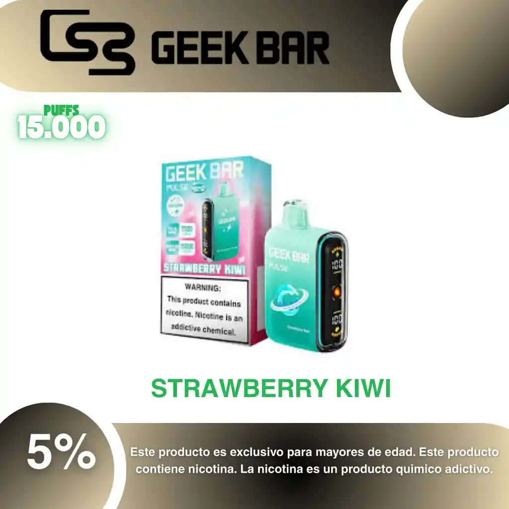 Geek Bar Pulse 15.000 Puffs, Sabor Fresa Kiwi 5% PROHIBIDA LA VENTA A MENORES DE EDAD. ADVERTENCIA: ESTE PRODUCTO CONTIENE NICOTINA, LA NICOTINA ES UNA SUSTANCIA QUIMICA ADICTIVA Y NOCIVA PARA LA SALUD. Los líquidos para vapeo contienen: propilenglicol USP, glicerina USP, sabor artificial y nicotina. Este producto puede contener nicotina, una sustancia altamente adictiva que puede generar dependencia, posibles afectaciones arteriales, cardiacas, pulmonares y otras aun no identificadas. No se recomienda su uso a mujeres en embarazo, puede generar lesiones al feto. Mantener alejado de niños y mascotas. No ingerir, puede generar irritación y/o intoxicación. Por favor antes de consumir consulte a su médico posibles afectaciones o sensibilidad a alguno de sus componentes. Los componentes de este producto pueden aumentar la sensación de ansiedad En caso de notar alguna reacción adversa por favor suspenda su uso de manera inmediata. Siga las instrucciones en el envase. No alterar sus componentes. Adquiera sus productos en sitios de confianza No use productos piratas, alterados, o en los cuales no pueda comprobar su buena procedencia, Verifique la reputación del fabricante y distribuidor antes de adquirir cualquier producto Si no es usuario fumador o vapeador no se recomienda su uso bajo ninguna circunstancia Al usar este producto usted es consciente que este producto puede generar afectaciones a su salud, incluyendo aquellas que a la fecha de la compra no se han identificado y que pueden aparecer a largo plazo