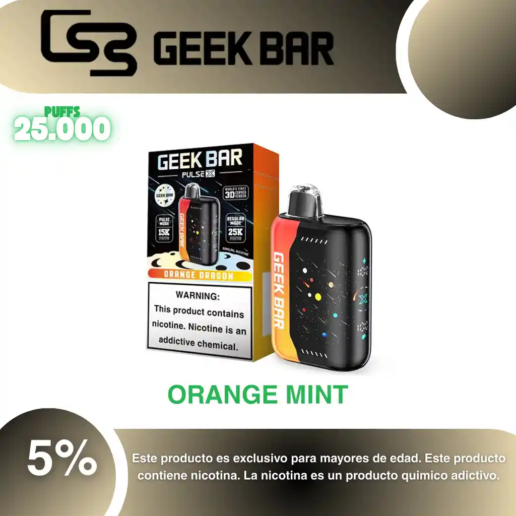 Geek Bar Pulse X 25.000 Sabor Naranja Mentolada 5% PROHIBIDA LA VENTA A MENORES DE EDAD. ADVERTENCIA: ESTE PRODUCTO CONTIENE NICOTINA, LA NICOTINA ES UNA SUSTANCIA QUIMICA ADICTIVA Y NOCIVA PARA LA SALUD. Los líquidos para vapeo contienen: propilenglicol USP, glicerina USP, sabor artificial y nicotina. Este producto puede contener nicotina, una sustancia altamente adictiva que puede generar dependencia, posibles afectaciones arteriales, cardiacas, pulmonares y otras aun no identificadas. No se recomienda su uso a mujeres en embarazo, puede generar lesiones al feto. Mantener alejado de niños y mascotas. No ingerir, puede generar irritación y/o intoxicación. Por favor antes de consumir consulte a su médico posibles afectaciones o sensibilidad a alguno de sus componentes. Los componentes de este producto pueden aumentar la sensación de ansiedad En caso de notar alguna reacción adversa por favor suspenda su uso de manera inmediata. Siga las instrucciones en el envase. No alterar sus componentes. Adquiera sus productos en sitios de confianza No use productos piratas, alterados, o en los cuales no pueda comprobar su buena procedencia, Verifique la reputación del fabricante y distribuidor antes de adquirir cualquier producto Si no es usuario fumador o vapeador no se recomienda su uso bajo ninguna circunstancia Al usar este producto usted es consciente que este producto puede generar afectaciones a su salud, incluyendo aquellas que a la fecha de la compra no se han identificado y que pueden aparecer a largo plazo