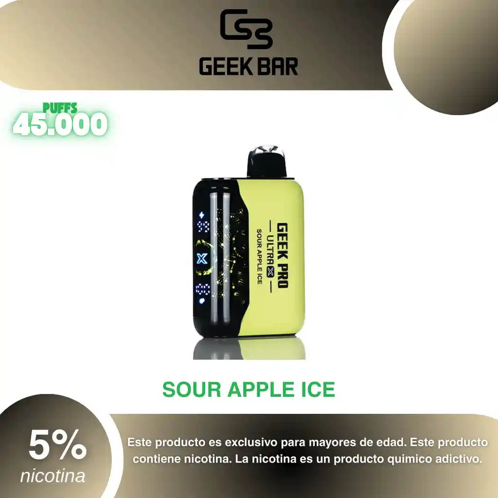 Geek Pro Ultra X 45.000 Puffs, Sabor Manzana Verde Mentolada 5% PROHIBIDA LA VENTA A MENORES DE EDAD. ADVERTENCIA: ESTE PRODUCTO CONTIENE NICOTINA, LA NICOTINA ES UNA SUSTANCIA QUIMICA ADICTIVA Y NOCIVA PARA LA SALUD. Los líquidos para vapeo contienen: propilenglicol USP, glicerina USP, sabor artificial y nicotina. Este producto puede contener nicotina, una sustancia altamente adictiva que puede generar dependencia, posibles afectaciones arteriales, cardiacas, pulmonares y otras aun no identificadas. No se recomienda su uso a mujeres en embarazo, puede generar lesiones al feto. Mantener alejado de niños y mascotas. No ingerir, puede generar irritación y/o intoxicación. Por favor antes de consumir consulte a su médico posibles afectaciones o sensibilidad a alguno de sus componentes. Los componentes de este producto pueden aumentar la sensación de ansiedad En caso de notar alguna reacción adversa por favor suspenda su uso de manera inmediata. Siga las instrucciones en el envase. No alterar sus componentes. Adquiera sus productos en sitios de confianza No use productos piratas, alterados, o en los cuales no pueda comprobar su buena procedencia, Verifique la reputación del fabricante y distribuidor antes de adquirir cualquier producto Si no es usuario fumador o vapeador no se recomienda su uso bajo ninguna circunstancia Al usar este producto usted es consciente que este producto puede generar afectaciones a su salud, incluyendo aquellas que a la fecha de la compra no se han identificado y que pueden aparecer a largo plazo