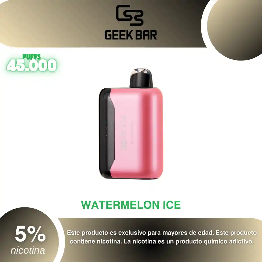 Geek Pro Ultra X 45.000 Puffs, Sabor Sandia Mentolada 5% PROHIBIDA LA VENTA A MENORES DE EDAD. ADVERTENCIA: ESTE PRODUCTO CONTIENE NICOTINA, LA NICOTINA ES UNA SUSTANCIA QUIMICA ADICTIVA Y NOCIVA PARA LA SALUD. Los líquidos para vapeo contienen: propilenglicol USP, glicerina USP, sabor artificial y nicotina. Este producto puede contener nicotina, una sustancia altamente adictiva que puede generar dependencia, posibles afectaciones arteriales, cardiacas, pulmonares y otras aun no identificadas. No se recomienda su uso a mujeres en embarazo, puede generar lesiones al feto. Mantener alejado de niños y mascotas. No ingerir, puede generar irritación y/o intoxicación. Por favor antes de consumir consulte a su médico posibles afectaciones o sensibilidad a alguno de sus componentes. Los componentes de este producto pueden aumentar la sensación de ansiedad En caso de notar alguna reacción adversa por favor suspenda su uso de manera inmediata. Siga las instrucciones en el envase. No alterar sus componentes. Adquiera sus productos en sitios de confianza No use productos piratas, alterados, o en los cuales no pueda comprobar su buena procedencia, Verifique la reputación del fabricante y distribuidor antes de adquirir cualquier producto Si no es usuario fumador o vapeador no se recomienda su uso bajo ninguna circunstancia Al usar este producto usted es consciente que este producto puede generar afectaciones a su salud, incluyendo aquellas que a la fecha de la compra no se han identificado y que pueden aparecer a largo plazo
