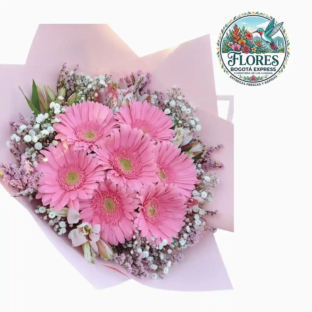 Encantador ramo que combina la frescura y belleza de las gerberas rosadas con la elegancia de las astromelias, acompañado de delicados toques de gypsophila (velo de novia) y follaje verde. Esta armoniosa mezcla de flores en tonos suaves transmite amor, dulzura y buenos deseos, siendo ideal para regalar en cumpleaños, aniversarios o cualquier ocasión especial. Su presentación en envoltura pastel resalta aún más su estilo romántico y sofisticado.