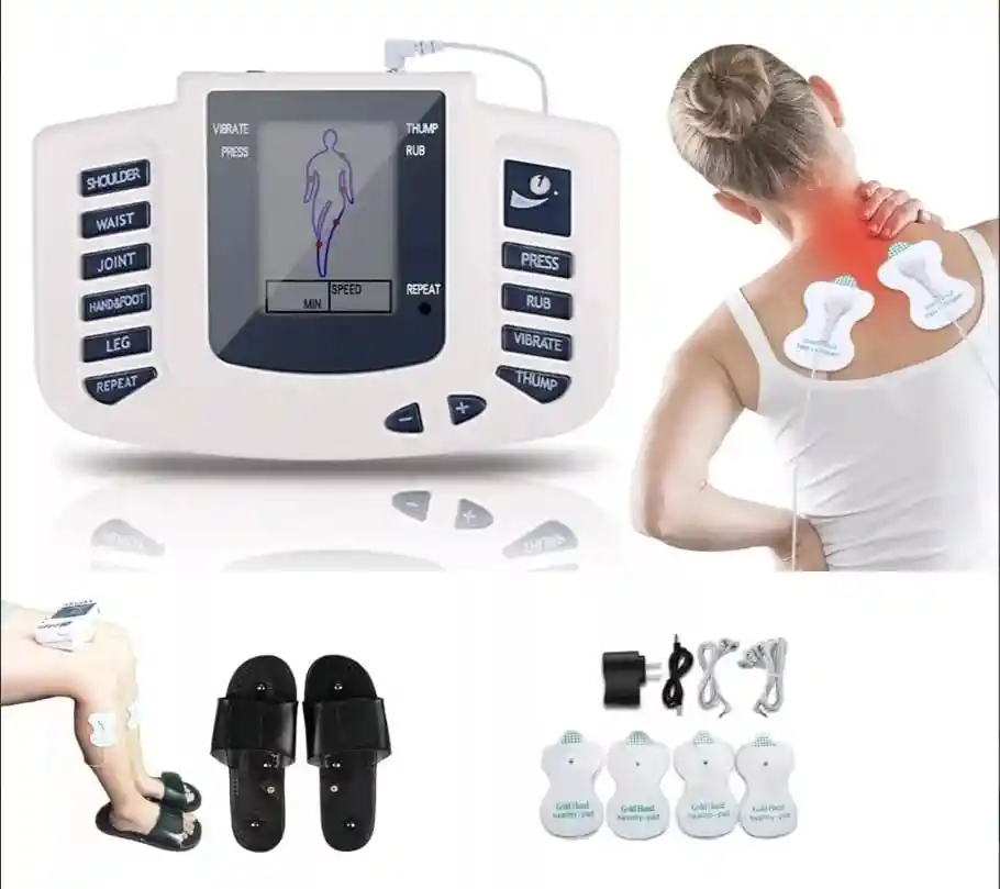 Electro Masajeador y Acupuntura portátil con pantalla Lcd, equipo de última generación desarrollado de acuerdo a la teoría de la Medicina Tradicional China, mejora la circulación del cuerpo, alivia el dolor y promueve el metabolismo ayuda también a quemar Grasa y Tonificar tu cuerpo. Posee 4 modos terapéuticos 8 modos de masaje y 10 niveles de potencia de masaje. Utiliza 4 electrodos infrarrojos para hacer la terapia física de las cuatro partes de su cuerpo al mismo tiempo. Es un producto ideal y conveniente para quienes padecen de hombros rígidos, fatiga en el cuerpo, dolor de estómago frío, dolor de cuello cervical, dolor de muelas, presión arterial alta, presión arterial baja, insuficiencia de energía, menstruación irregular y otras enfermedades crónicas graves. Este electroestimulador es el último modelo de los electroestimuladores digitales de la línea fitness y libre de gel que estimula los músculos abdominales 600 veces en 10 minutos, mejora la circulación del cuerpo, alivia el dolor y favorece el metabolismo. Adicionalmente, el electroestimulador te permitirá desarrollar los siguientes programas estéticos de salud: Reducción de medidas, tonificación de los músculos del cuerpo, eliminación del acné, borrado de estrías, disminución de medidas corporales, drenaje linfático, eliminación de cicatrices y eliminación de la celulitis.