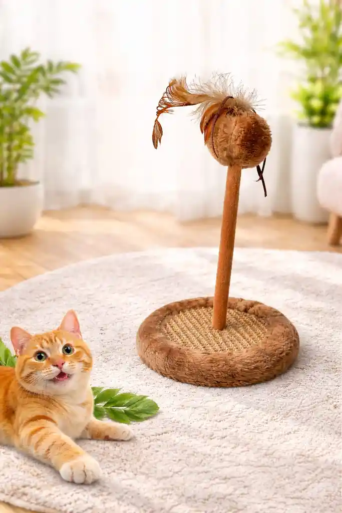 Rascador Interactivo con Pluma Dale a tu gato horas de diversión y cuidado con este práctico juguete: 🪶 Pelota con plumas que despierta su instinto de caza 🪵 Base con rascador ideal para afilar sus uñas 💪 Estructura firme y resistente 🏠 Perfecto para usar en casa