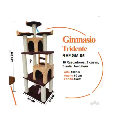 Descripción del Gimnasio Tridente para Gatos (REF. GM-05) El Gimnasio Tridente para gatos es el espacio perfecto para que tus felinos jueguen, descansen y afilen sus garras. Diseñado con una estructura resistente y multifuncional, ofrece 10 rascadores, 2 cómodas casas, 3 sofás acolchados y 1 práctica escalera que conecta sus diferentes niveles. Con una altura de 180 cm, ancho de 60 cm y fondo de 45 cm, este gimnasio proporciona un ambiente ideal para el entretenimiento y confort de uno o varios gatos, ayudando a mantenerlos activos, felices y alejados del estrés. Ideal para hogares con varios gatos o para quienes buscan ofrecerle a su mascota un espacio completo de diversión y descanso. ChatGPT El Gimnasio Tridente Mini para Gatos es un juguete diseñado especialmente para estimular física y mentalmente a los gatos, permitiéndoles mantenerse activos, divertidos y saludables dentro del hogar. Este gimnasio es ideal para gatitos de tamaño pequeño o mediano, y está diseñado para adaptarse a espacios reducidos sin perder funcionalidad. Características principales: Estructura compacta y resistente: El gimnasio tiene un diseño pequeño pero robusto, ideal para aquellos que tienen poco espacio en casa pero no quieren sacrificar el entretenimiento de sus gatos. Múltiples niveles y texturas: Incluye varias plataformas o postes de diferentes alturas, y una variedad de materiales como sisal, alfombra o tela suave, que ayudan a satisfacer las necesidades de rascado de los gatos y a mejorar su agilidad. Elementos interactivos: El gimnasio puede contar con bolas colgantes, plumas o juguetes pequeños que motivan al gato a jugar, saltar y explorar. Esto también contribuye a mantener su mente estimulada. Fácil de montar: Generalmente, los gimnasios Tridente Mini están diseñados para ser fáciles de montar, sin necesidad de herramientas complicadas. Diseño atractivo: Aunque su tamaño es pequeño, su diseño moderno y funcional lo hace apto para integrarse a cualquier tipo de decoración del hogar. Ideal para gatitos y gatos jóvenes: Debido a su tamaño y características, es perfecto para gatitos, gatos jóvenes o aquellos con menos fuerza física, ya que permite un entrenamiento sin esfuerzo excesivo. Este tipo de gimnasios ayuda a los gatos a ejercitarse y a prevenir problemas de comportamiento derivados del aburrimiento, como rascar muebles o morder objetos no deseados. También es útil para mantenerlos en forma y evitar el sobrepeso.