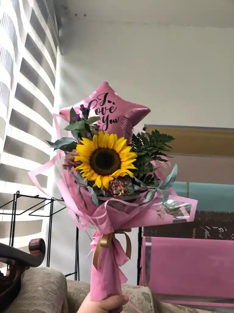 girasol con follaje envuelto en papel coreano, incluye tarjeta y globo alusivos al día de las flores amarillas