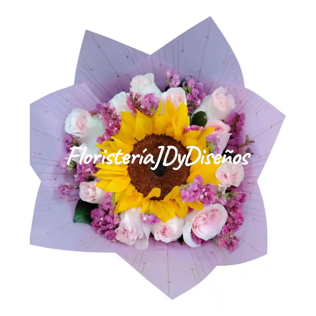 DETALLE FLORAL DE 1 DOCENA DE ROSA,1 GIRASOL, CON FOLLAJE8SIEMPRE VIVA, ORGAZIZADO EN PAPEL COREAÑO Y MOÑO EN CINTA DE PAPEL
