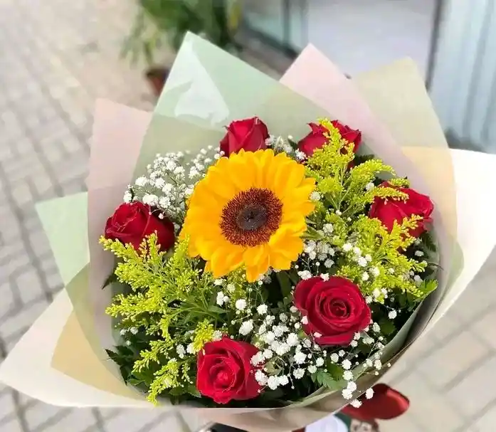 Rosas que abrazan un girasol radiante, creando un contraste perfecto entre la pasión y la luz. Un ramo sofisticado, ideal para conquistar corazones y llenar el día de belleza