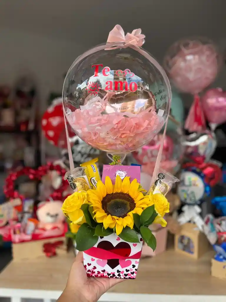 Caja cuadrada (varía según disponibilidad), girasol x1, rosa x2 (color varía según disponibilidad), follaje, dulces surtidos x4, globo burbuja personalizado frase corta