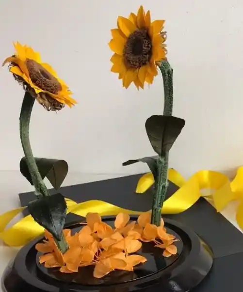 Los Girasoles de EL CLAVEL Y LA ROSA son 100% naturales, procesadas con tecnología ecológica y revolucionaria para mantener su belleza y frescura durante dos años o más.