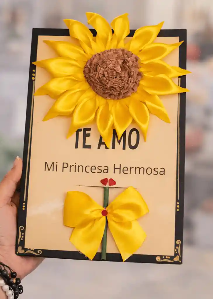 Girasol eterno en tarjeta con mensaje personalizado y listón (Escribenos el mensaje a personalizar en las observaciones)