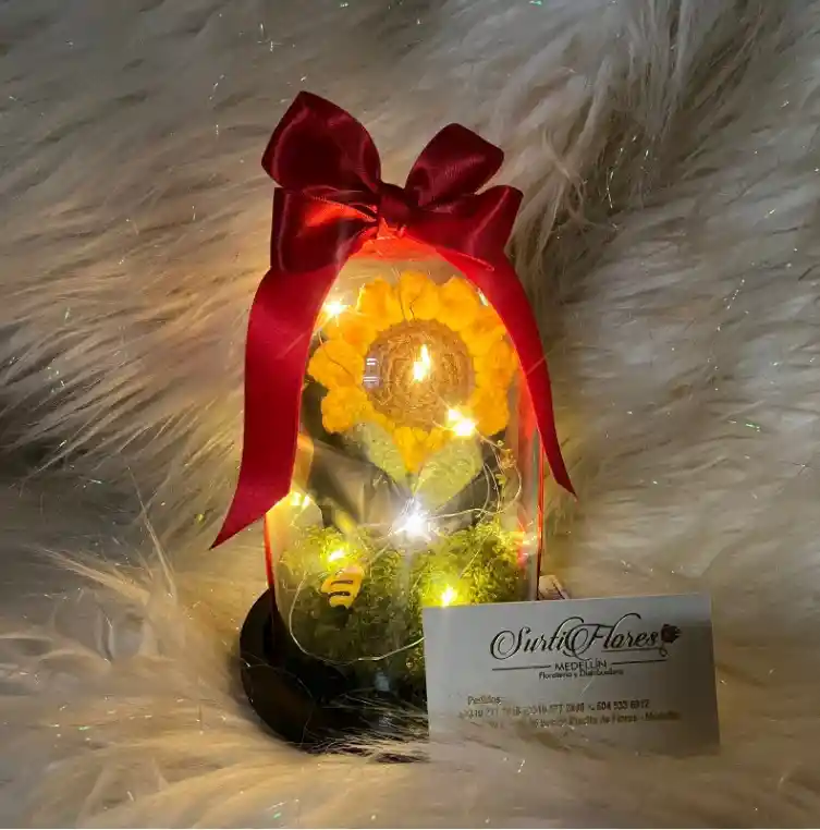 hermoso girasol tejido incluye cupula de vidrio, base de madera y luces, hermoso detalle eterno si lo cuidas bien dura toda la vida