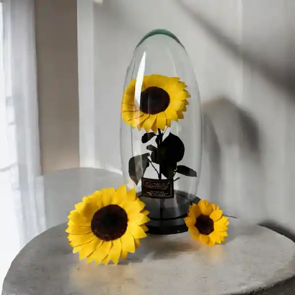 Girasol preservado en cúpula oval de vidrio Elegante y duradero, mide 43 cm de alto, ideal para decorar y regalar sin preocuparse por el mantenimiento.