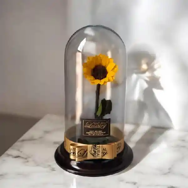 Girasol preservado en cúpula de vidrio. 🌻 Elegante y duradero, mide 27 cm de alto, ideal para decorar y regalar sin preocuparse por el mantenimiento.
