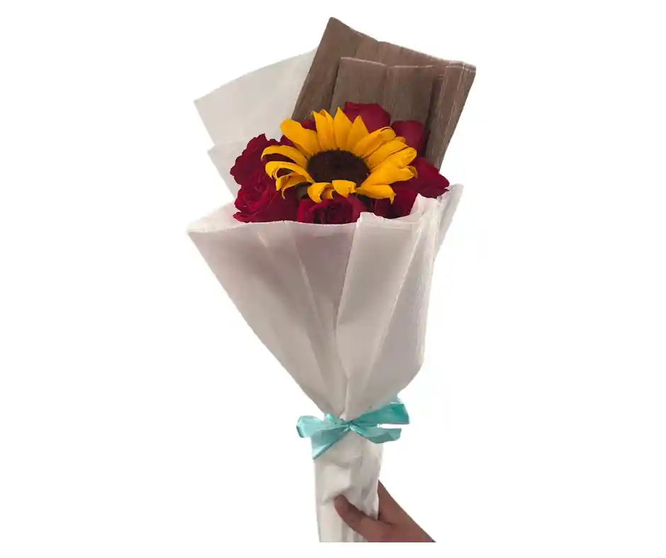 Incluye: Girasol x1, rosas rojas x10, envoltura en papel crepe, mensaje personalizado que puedes dejar en el chat de la tienda y decoración