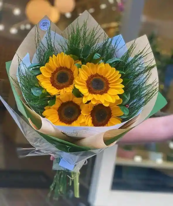 Ramo de mano incluye 3-5 girasoles mini o grandes segun disponibilidad con papel coreano especial para flores