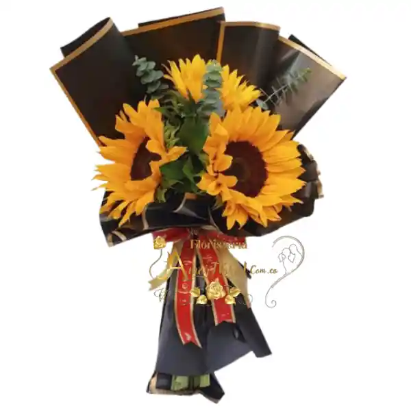 boquet por 3 girasoles, si deseas un mensaje para la tarjeta lo puedes dejar escrito en el área de observaciones o escribirnos al whatsapp al 3143111616 y enviarnos el mensaje para la tarjeta.