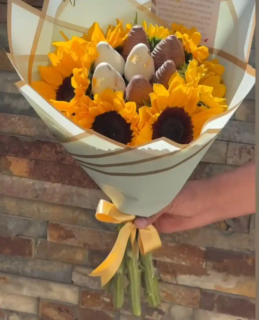 Hermoso bouquet de girasoles con 6 unidades,, fresas cubiertas con fino chocolate, delicadamente decoradas, papel decorativo, moño, tarjeta con mensaje personalizado