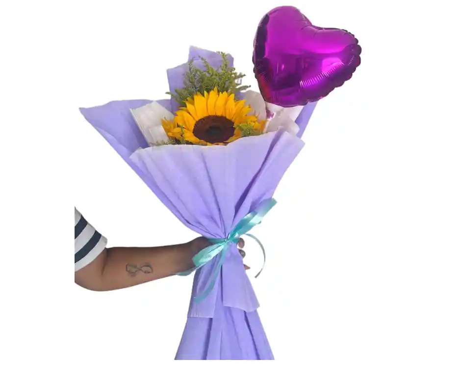 Incluye. Girasoles x5, solidago, globo metalizado, envoltura en papel crepe y decoración. Puedes dejar el mensaje que deseas que vaya con tus flores en el chat de la tienda