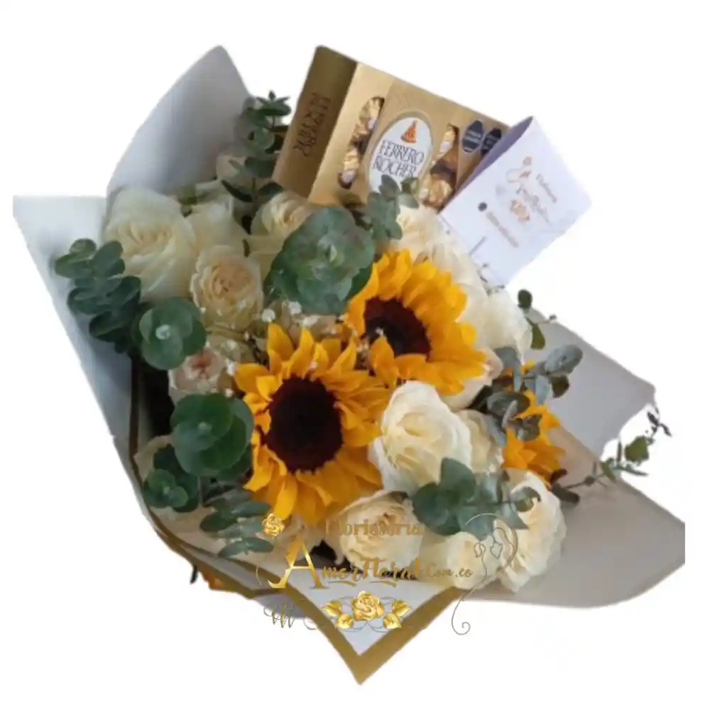 bouquet por 36 rosas y 4 unidades de girasol, ferrero por 8 unidades, si deseas un mensaje para la tarjeta lo puedes dejar escrito en el área de observaciones o escribirnos al whatsapp al 3143111616 y enviarnos el mensaje para la tarjeta.