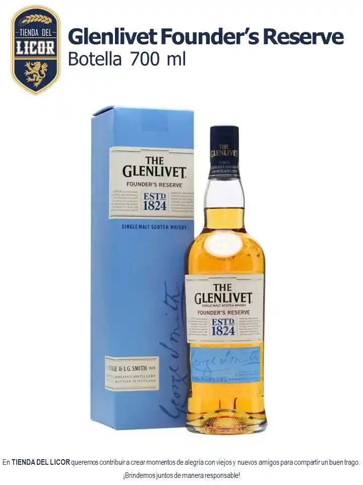 Con Los Sabores Clásicos De The Glenlivet Unidos En Una Textura Cremosa Y Suave, El Whisky De Malta The Glenlivet Founder'S Reserve Es Un Tributo Al Hombre Que Lo Inició Todo. Cuando George Smith Comenzó A Destilar, The Glenlivet No Tenía Declaraciones De Edad Y George Smith Seleccionó Whisky De Barriles De Diferentes Edades. Hecho Con Agua De Los Mismos Arroyos Cristalinos De La Montaña, En El Mismo Aire Frío Y Puro, The Glenlivet Founder'S Reserve Es Tan Suave Y Afrutado Como El Whisky Que Salió De Los Alambiques De Cobre Originales. Las Tradicionales Barricas De Roble En Las Que Se Madura El Whisky Dan A Cada Expresión Sus Propias Características Distintivas. Luego, Para Darle Un Toque Moderno Al Sabor De La Expresión, El Maestro Destilador Alan Winchester Combina Una Selección De Barricas De Roble Envejecido Y Barricas De Roble Americano De Primer Llenado. El Uso Selectivo De Estas Barricas Proporciona Una Dulzura Suave Y Cremosa Que Se Mezcla Armoniosamente Con Los Delicados Sabores Y Los Complejos Tonos Afrutados Ya Presentes En El Whisky. . Prohíbase El Expendio De Bebidas Embriagantes A Menores De Edad Ley 124 1994.