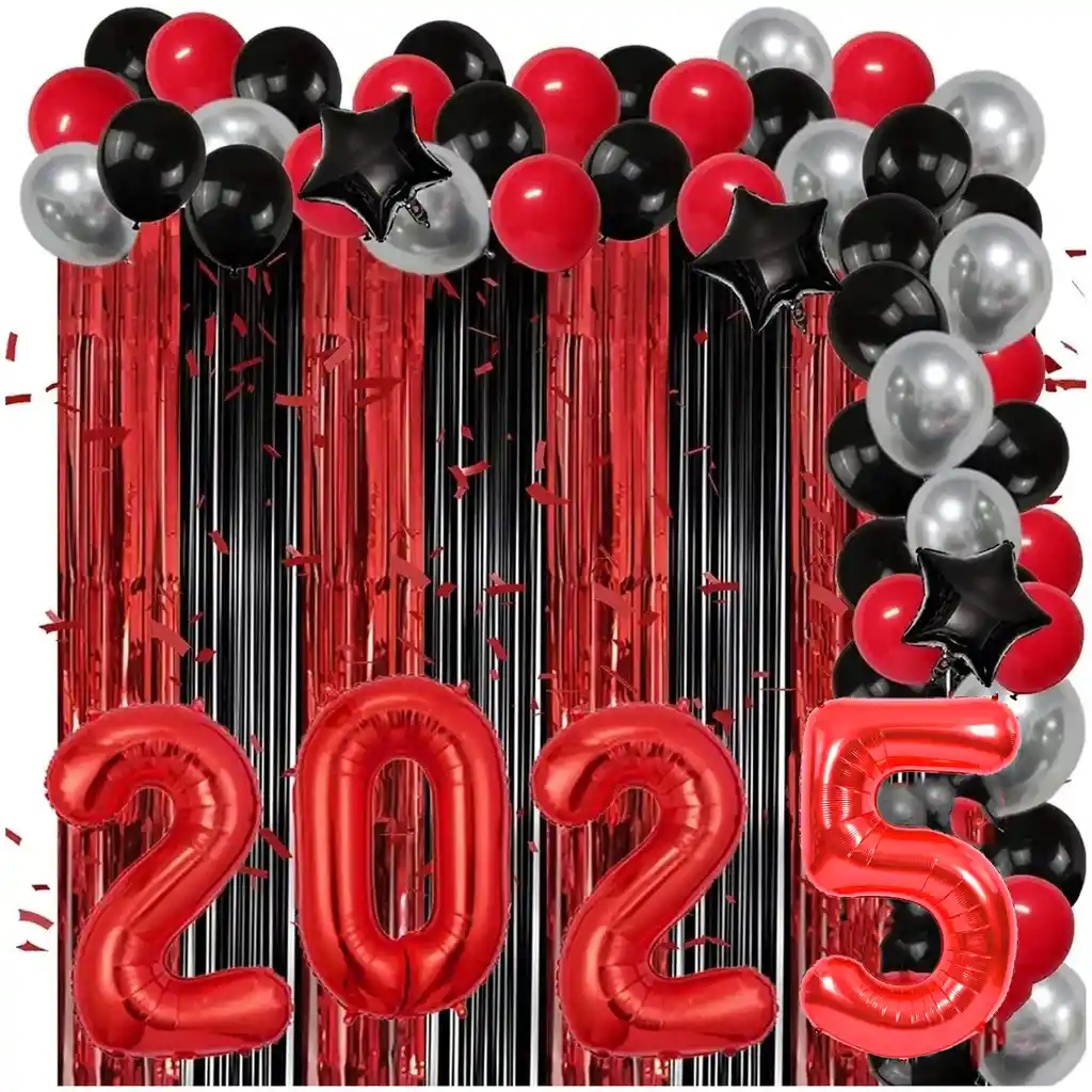 *********************GLOBOS Y PELUCHES MASMELO********************* Por tu compra Llevas: 15 Globo plateado cromado 30cm 3 Globo estrella metalizada 30cm 35 globo rojo 30cm 35 Globo negro 30cm un numero 2025 82cm de altura 1 Cortina metalizada roja 2x1m 1 Cortina metalizada negra 2x1m 1 Cinta para armar arco 5m 1 Pegatina 100 puntos adhesivos Si necesitas variación en los colores, colocarle un número o realizar algunos cambios en el diseño original escribenos para ver si podemos hacerlo. Si deseas adicionar otros articulos a tu compra puedes escribirnos, recuerda que Somos Globos y Peluches Masmelo. Tenemos disponible: Vasos, platos, manteles, guirnaldas, cubiertos, globos de todo tipo, números, letreros, velas. Puedes encontrar los articulos de nuestra tienda en el siguiente link, copia y pega, si no encuentas todo lo que necesitas escribenos: - En ciudades fuera de Bogotá despachamos para el mismo día si compras antes de las 11AM (no incluye festivos) - En Bogotá despachamos para el mismo día, si haces el pedido antes de las 4PM (no incluye festivos)