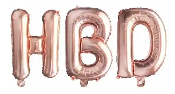 GLOBO HBD EN COLOR ORO ROSA LETRAS DE 80CM DE ALTO CADA LETRA DISPONIBILIDAD INMEDIATA GLOBOS ESPECIALES PARA CUMPLEAÑOS CELEBRACIONES ESPECIALES NOTA: LOS GLOBOS VIENEN SIN INFLAR ANÍMATE Y HAZ TU FIESTA INOLVIDABLE