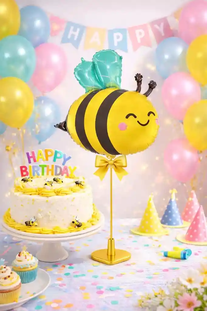 Dale un toque tierno, alegre y original a tus celebraciones con este hermoso globo metalizado en forma de abejita. Ideal para decorar cumpleaños infantiles, baby shower, fiestas temáticas o mesas dulces. Su diseño adorable y tamaño grande lo convierten en un punto focal perfecto para la decoración, creando un ambiente divertido y llamativo para fotos y celebraciones. Características: * Diseño: Abejita sonriente * Material: Globo metalizado (foil) * Tamaño aproximado: 81 x 65 cm * Ideal para decoración de cumpleaños, baby shower, fiestas infantiles y eventos temáticos * Se puede inflar con aire o helio Importante: La compra incluye únicamente el globo metalizado de abejita. El portaglobos, pastel, dulces, globos adicionales u otros accesorios que aparecen en la imagen son solo para ambientar la fotografía y no están incluidos. 🎉 Perfecto para crear decoraciones tiernas y llamativas en cualquier celebración infantil.