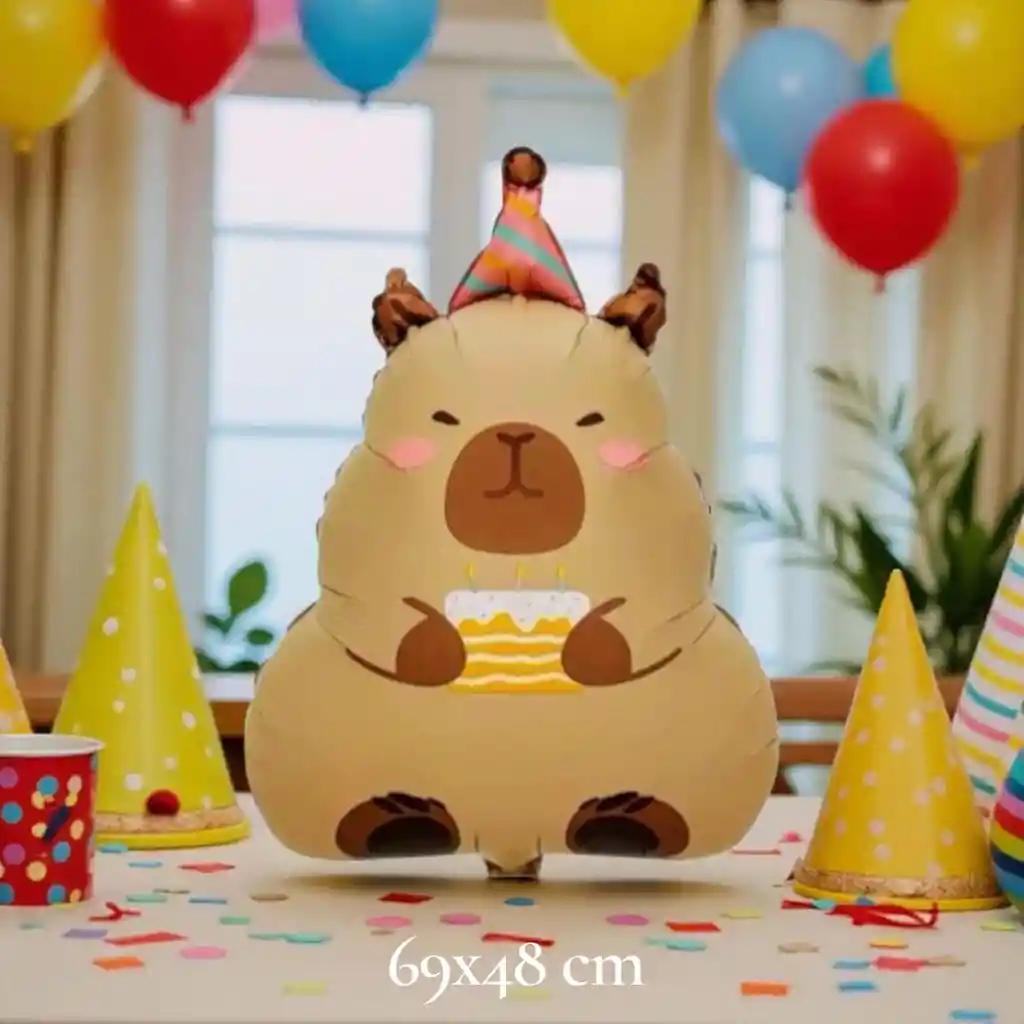 Globo Metalizado Capibara Grande 69x48 cm Descripción: Celebra con estilo con este adorable globo metalizado de Capibara tamaño grande (69x48 cm). Ideal para fiestas, cumpleaños y decoraciones temáticas. Su diseño tierno y divertido lo convierte en el centro de atención en cualquier celebración. * Incluye: 1 globo metalizado Capibara * Importante: El globo se entrega desinflado. * No incluye accesorios ni elementos adicionales mostrados en la imagen, solo el globo descrito.