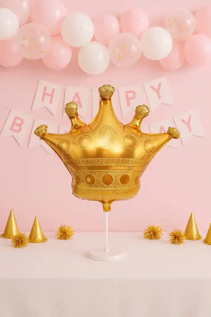 Globo Metalizado Corona Dorada 14" (X1 Unidad) Decora tus celebraciones con estilo y elegancia con este globo metalizado en forma de corona dorada de 14 pulgadas, ideal para cumpleaños, fiestas temáticas, sesiones de fotos o decoraciones de mesa. Su acabado brillante y diseño realzarán cualquier ambiente con un toque de lujo. •Incluye: 1 globo metalizado corona dorada de 14" (una unidad). * Nota importante: Los demás elementos que aparecen en la fotografía (mantel, globos adicionales, gorros, decoración, etc.) se muestran únicamente para ambientar la imagen y no están incluidos. •El globo se envía desinflado.