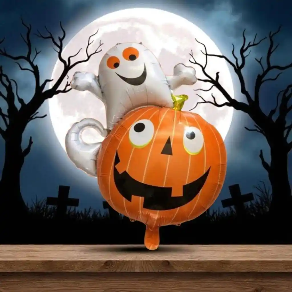 Globo Metalizado Fantasma con Calabaza Halloween 35x25 cm Descripción: Decora tu fiesta con este encantador globo metalizado en forma de fantasma con calabaza, perfecto para ambientar espacios de Halloween con un toque alegre y divertido. Hecho en material duradero, puede inflarse con aire o helio según prefieras. Tener en cuenta: •Solo incluye el globo. Los demás elementos son de ambientación. •El globo se envía desinflado
