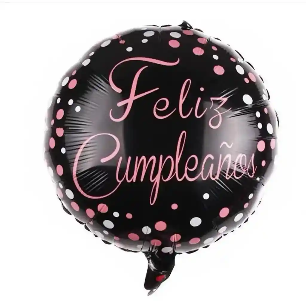 Globo metalizado Feliz Cumpleaños color negro con puntos rosados y blanco, en tamaño 18" inflado con helio. Duración: 1 día inflado con helio aproximadamente. (Nuestro helio es 100% certificado NO es inflamable)