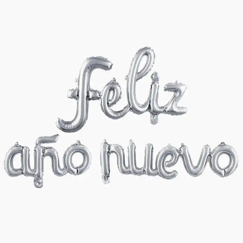 FRASE GLOBO CURSIVA FELIZ AÑO NUEVO Cartel de globos letras cursiva año nuevo en color Plateado, solo inflar con aire y daras un ambiente especial a tu lugar favorito. •Imagen referencial del producto