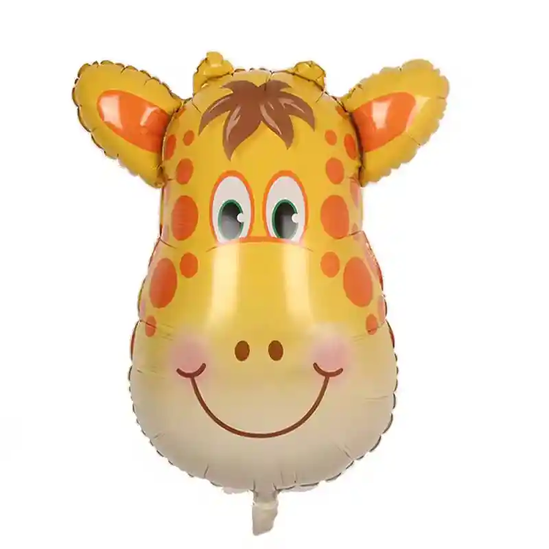 Globo metalizado en forma de cara de jirafa, en tamaño de 60 x 55 cm, sin inflar. Incluye: Pitillo para inflar el globo con aire.