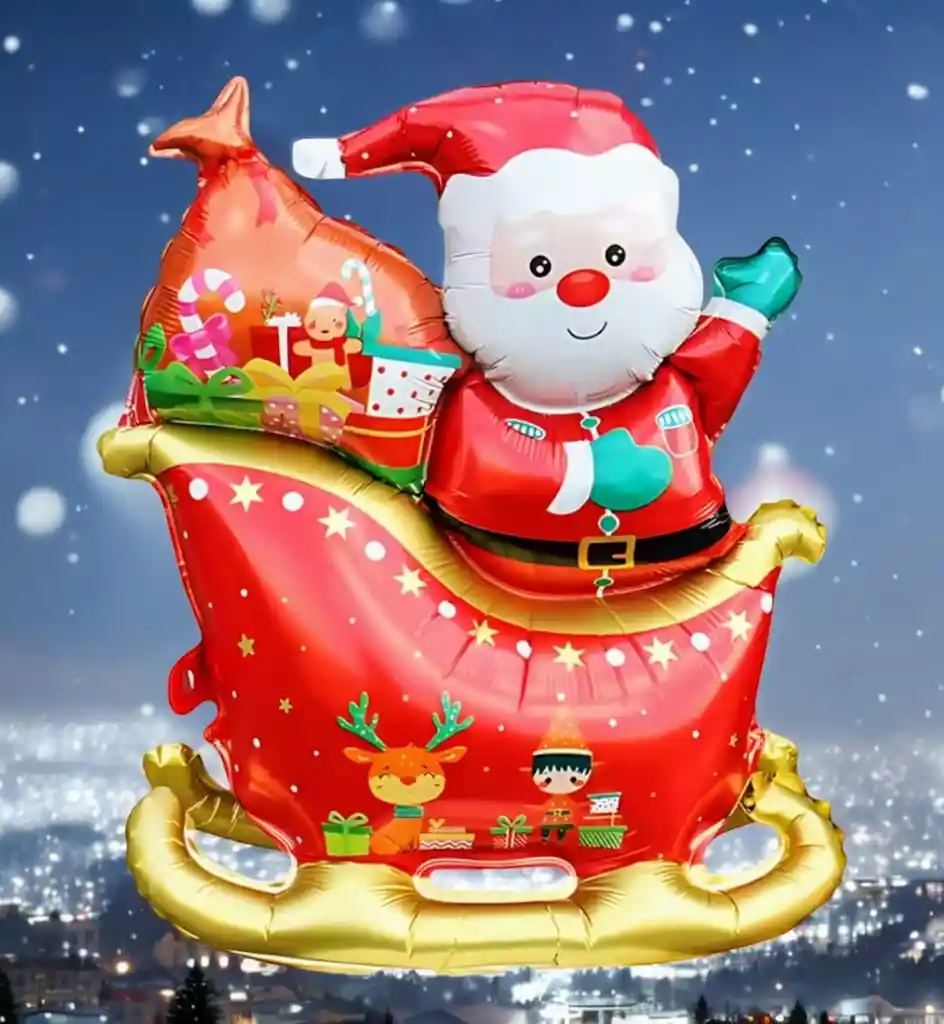 Celebra la magia de la Navidad con este hermoso globo metalizado de Santa Claus en su trineo, perfecto para decorar fiestas, hogares, negocios y crear ambientes realmente festivos. Su diseño colorido y detalles brillantes lo hacen ideal para fotos, mesas temáticas y decoración navideña. Características: •Medidas: 74 cm de alto x 58 cm de ancho •Diseño de Santa Claus en trineo con colores vivos •Material foil metalizado resistente y de alta calidad •Ideal para decoración navideña, vitrinas, eventos y celebraciones familiares •Fácil de inflar con bomba manual o pajilla Importante: •El globo viene desinflado.